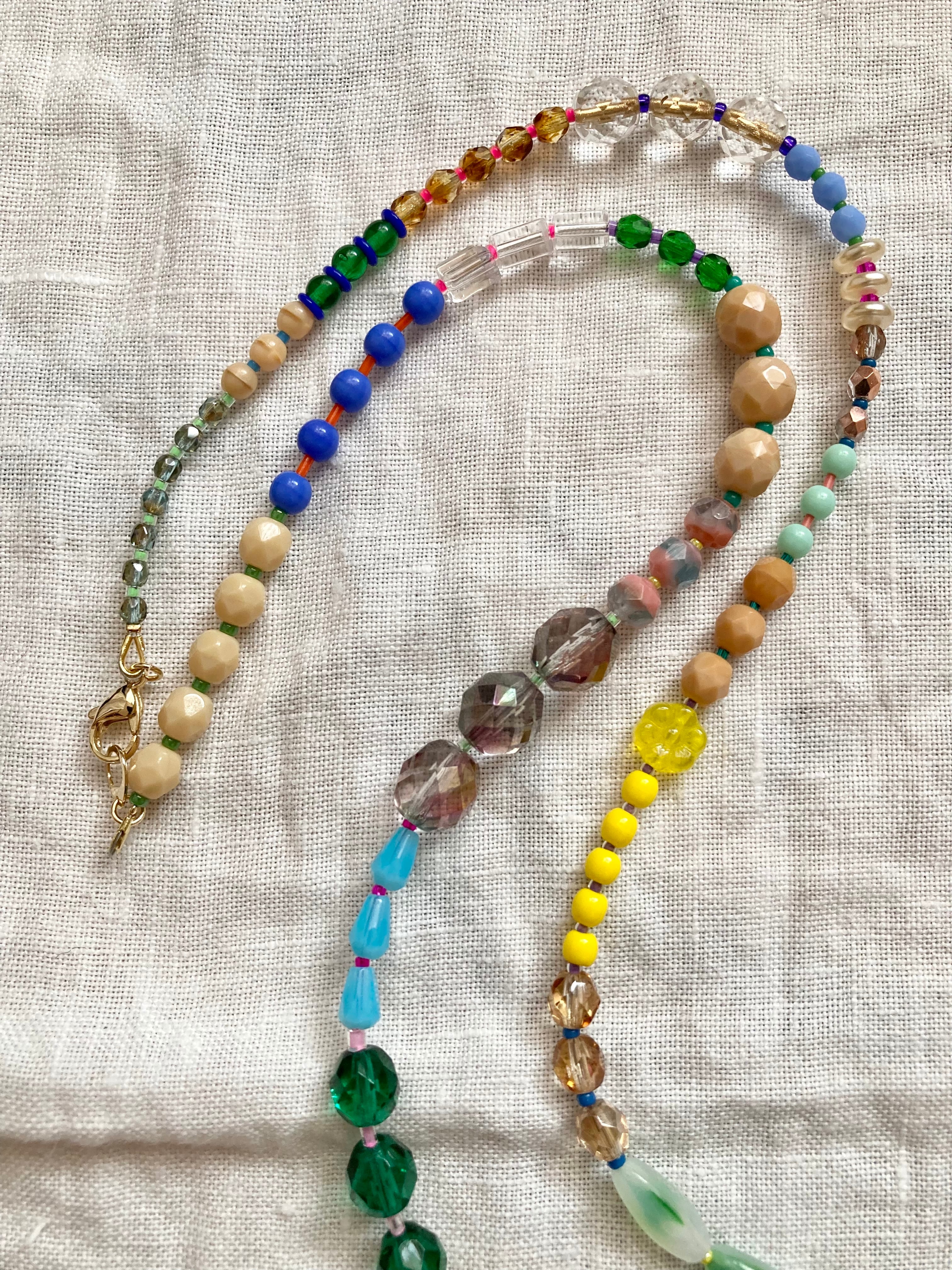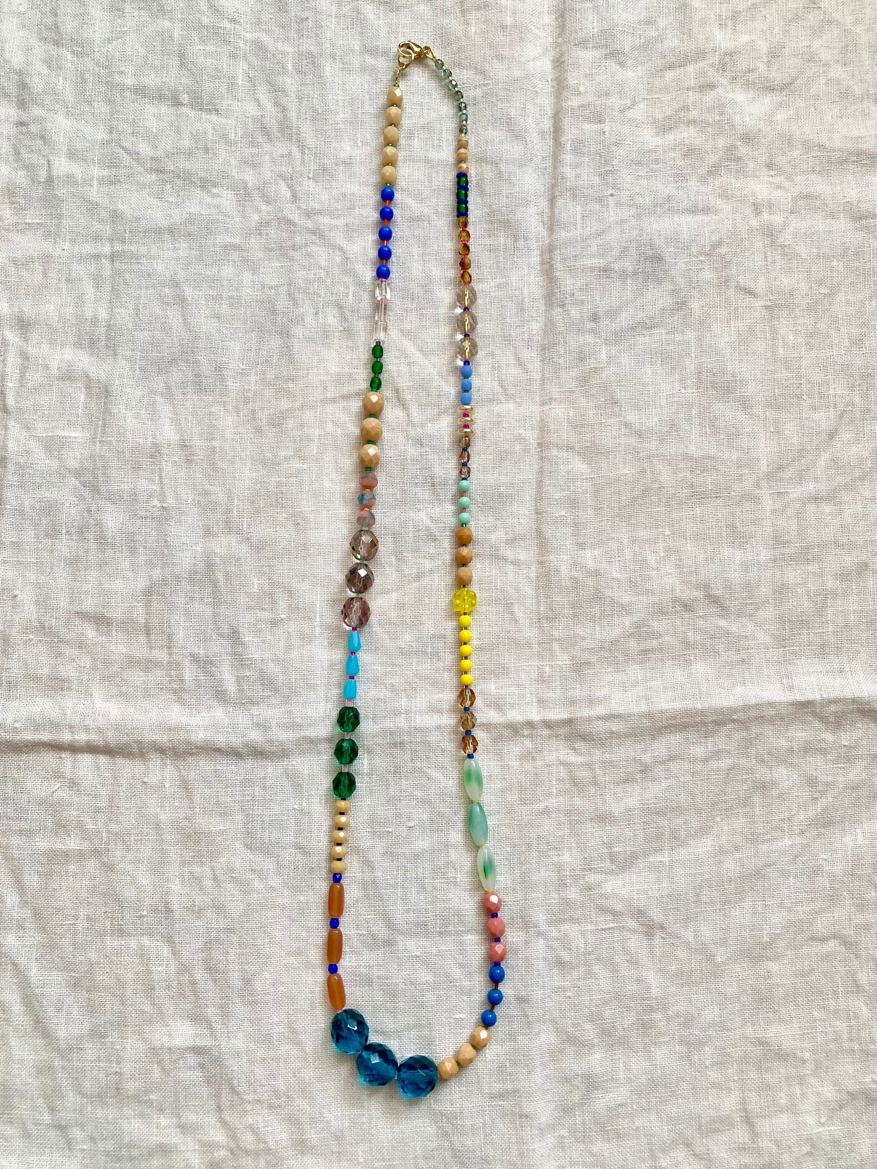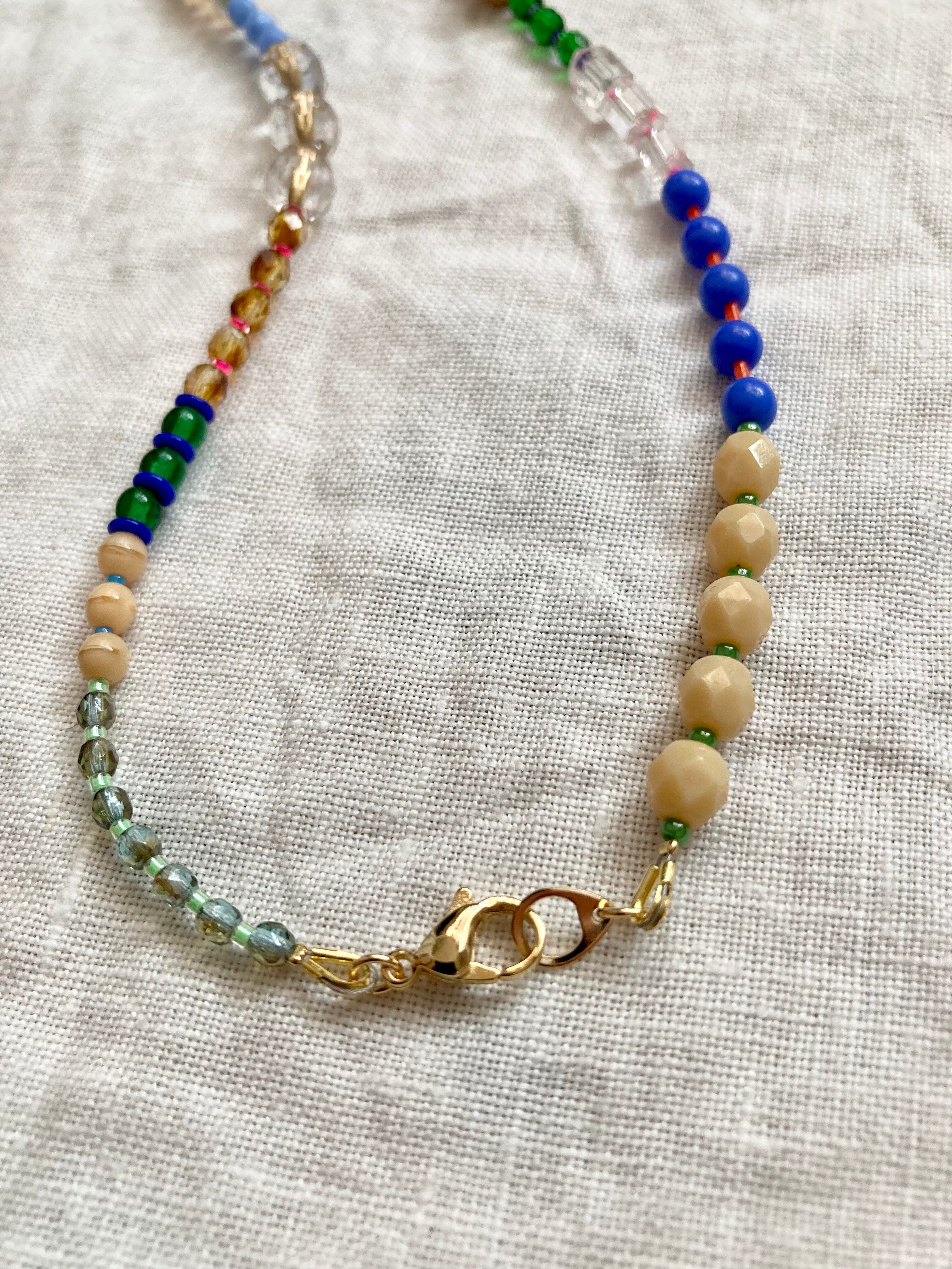 チェコ、イタリア、フランスのビーズを使ってカラフルなネックレスにしてみました。ブルーの大きなビーズと黄色いビーズがアクセントでシンプルなお洋服から花柄やギンガムチェックのお洋服にも合うかと思います♪